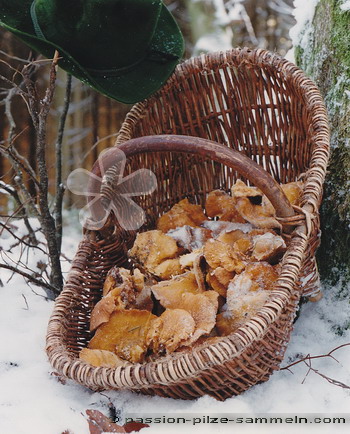 Was aber letztlich nicht nötig war. Wohlbehalten landete die gefrorene Pilzfracht - hier mit dunkelgrünem Jägerhut - zu Hause und schließlich in der Friteuse. Welch ein leckerer Winterschmaus...