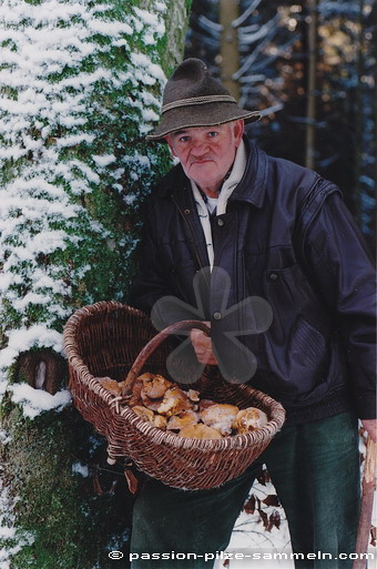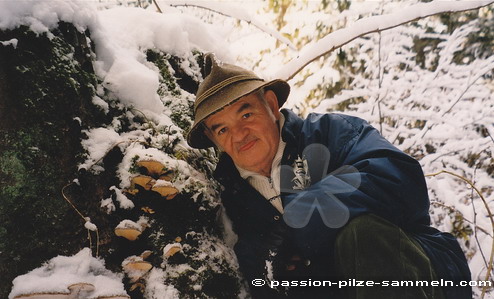 Foto rechts: So sieht es aus, wenn Karl Berchtold zur Austernpilz-Ernte anrückt. Mit einer Alu-Leiter, einem langen Stecken mit messerscharfem Spachtel und dem Pilzkorb schreitet er durch den verschneiten Wald. Nach lohnenswerten Fundstellen hat er in der Regel einen Tag zuvor Ausschau gehalten.