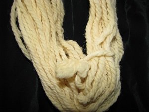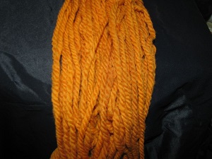 Foto: Prachtvolle Auswahl von mit Pilzen gefärbter Wolle, alle Stränge aus der Hand von Peter Rohland. Welch ein erwärmender Anblick vor den winterlich kahlen Bäumen!