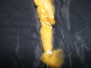 2 Fotos: Links und rechts sehen wir Wolle vom Blutblättrigen Hautkopf mit Alaun.
