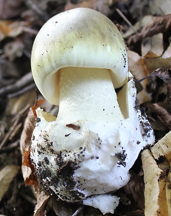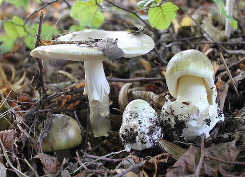Foto: Grüne Knollenblätterpilze unter einer Hainbuche: Gut ist die lappig und schlaff hängende faltige Manschette am stehenden Altpilz zu erkennen. Sowie zumindest andeutungsweise die zarte Zickzack-Schraffur am Stiel. Der kleine Pilz rechts daneben ist noch wie von einer Eihülle komplett umschlossen. Vorsicht! Er ist in diesem Stadium einem Bovist täuschend ähnlich. Ein Längsschnitt kontrollhalber zeigt aber: Im Knollenblätterpilz findet sich wie ein Embryo der spätere Pilz, während der Bovist eine konturlose gleichmäßige Füllung aufweist.
