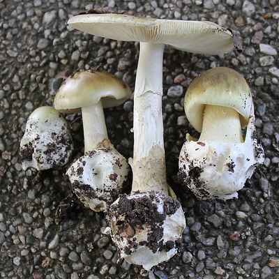 Foto: Knollige Angelegenheit: Außerordentlich markant ist bei diesen Grünen Knollenblätterpilzen die dicke Knollenbildung mitsamt der umgebenden Hülltasche zu sehen. Typisch ist auch das schmutzige Olivgrün der Hüte.