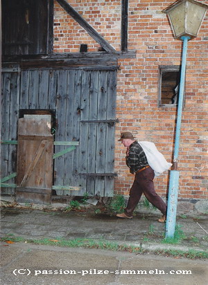 Foto rechts: Ein Bild wie aus versunkenen Tagen: So ähnlich sah es bis in die 60er Jahre auf dem Lande aus, wenn Pilzsammler von ihrer Ernte auch Freunden oder Bekannten etwas brachten. Kunde, der hier mit Sohn Thomas durch Ribnitz-Damgarten marschiert, hält diese so gut wie verlorene Tradition bis heute aufrecht.