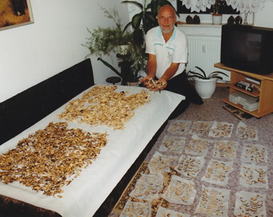 Alles wird gewissenhaft verarbeitet: „Früher haben wir Steinpilze und Maronenroehrlinge zum Trocknen aufgefädelt. Seit ein paar Jahren lassen wir sie scheibchenweise auf ausgelegten Pergamentpapierbögen trocknen. Manchmal nehmen tausende Scheiben Steinpilze und Maronenroehrlinge Schränke, Betten und die Fußböden ganzer Zimmer in Beschlag.