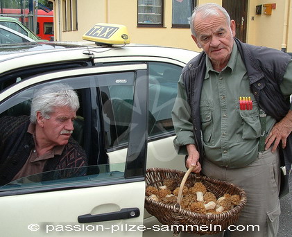 Gespräch am Taxi-Stand: Karl Berchtold fachsimpelt mit einem Taxler vor dem Gautinger S-Bahnhof. Der Fund ist stattlich, an Kugelschreibern für die Pilz-Buchhaltung fehlt es sichtlich nicht. Ob es die Aussicht auf Schreibarbeit ist, die den Pilzsammler so finster dreinschauen lässt?
