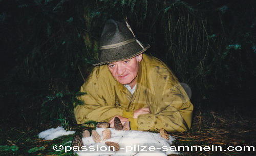 Morcheln im Schnee: Wenn die letzten Schneeflecken schmilzen, ist Karl Berchtold bereits auf Morchelsuche. "Es ist nicht so, dass sie unter Schnee wachsen, aber wenn sie bereits da sind und es draufschneit, muss ich zur Stelle sein." Diesen Fundort unter einer Fichte am Waldrand kennt Berchtold seit über 20 Jahren.