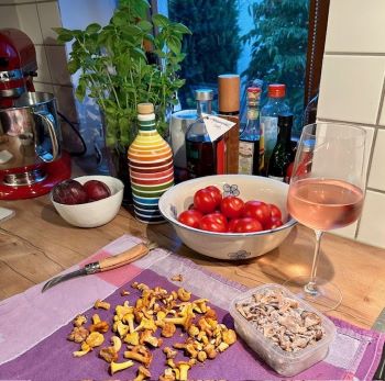 Aber nach wie vor waren in den jungen Eichenwäldchen Mengen an Pfifferlingen vertreten, die natürlich in unsere Pilzkörbe wanderten und abends zu einer köstlichen Nudelsoße verarbeitet wurden. Mit Bandnudeln, einem guten Parmesan und einem Glas kalten Weißweins wie immer ein Genuss.
