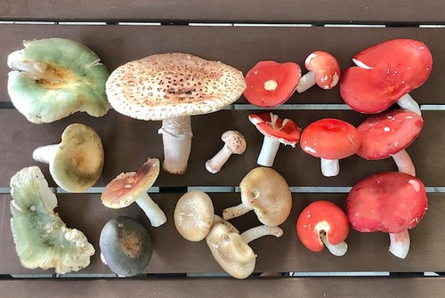 Foto: Drei Grünfelderige Täublinge, ein Fleischroter Speisetäubling und darunter ein Frauentäubling, ein großer und ein kleiner Perlpilz, darunter drei Sägeblättlinge und acht schöne Harte Zinnobertäublinge fand Thomas diesmal. Trotz hartnäckiger Trockenheit ergab das eine schöne Mischpilzpfanne. (8 Fotos © Thomas)
