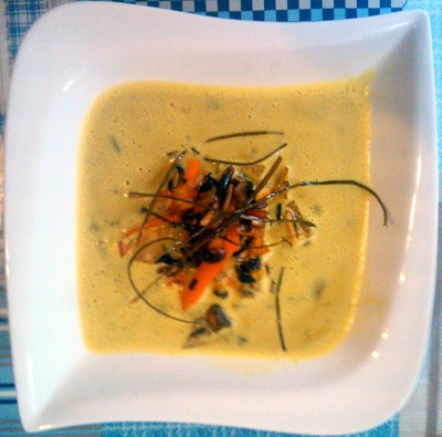 Suppe mit Piripiri oder Ingwer abschmecken, für die Farbe 1 TL Kurkuma zugeben.