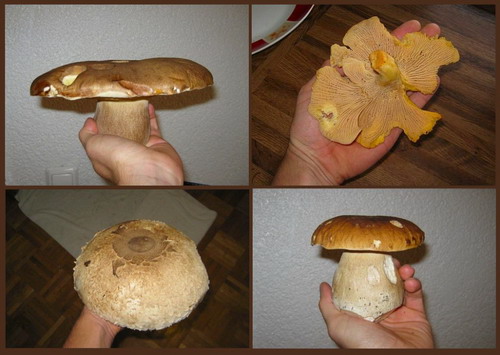 Foto: Anstelle zahlreicher Fotos, die eher die Menge von Michaels gefundenen Pilzen belegen, zeigen wir hier eine Collage mit dem handtellergroßen, 105 Gramm schweren Prachtexemplar von Pfifferling. Links oben ein Sommer-, rechts unten ein Fichtensteinpilz. Links eine Parasole. (Foto © Michael S.)