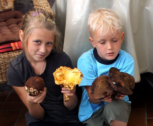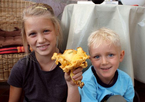 Foto: Hier zeigen Anastasia und Adrian lachend den größten Pfifferling, den sie und ihre Mama je gesehen haben. Er wiegt 280 Gramm!