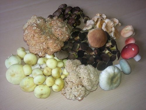 Foto: Fast wie helle Weintrauben muten die Pfirsichtäublinge links unten an. Rechts unten, das sind vermutlich Grüngefelderte, darüber Apfel- oder Rote Heringstäublinge und wiederum darüber ein Fleischroter Speisetäubling. In der Mitte schöne dunkle Rotfüße, darüber dunkle Schwarzblauende Röhrlinge, sonst Krause Glucken, Pfifferlinge und ein Steinpilz. Ein Foto, fast wie ein Gemälde!