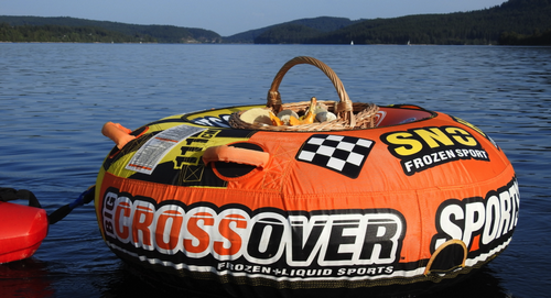 Foto: Die Pilze sind auf hoher See. Links sieht man das Schleppseil zum Kajak. Halbe Fahrt voraus! »Pilz-Logistics by sea« überschreibt Oliver den Transport der kostbaren Ware.