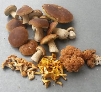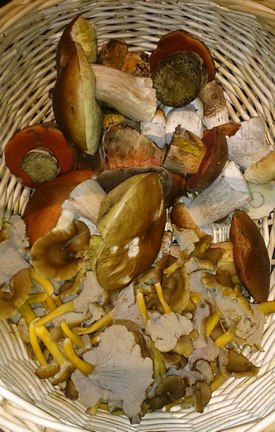 Anbei meine "kleine" Ausbeute vom heutigen Samstag. Wunderschöne Rotkappen, Hexenröhrlinge, Trompetenpfifferlinge wie auch einige Steinpilze schmücken meinen Korb (Foto rechts).