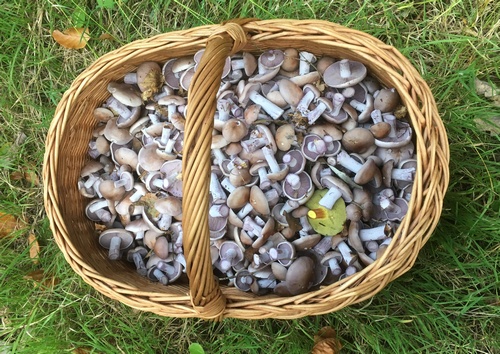 Foto: Was Ralf mit dieser Menge Violetter Rötelritterlinge wohl gemacht hat? Sie sind traditionelle Einlegepilze. Was mag das einsame Rotfüßchen wohl dazu gedacht haben? (Foto © Ralf)