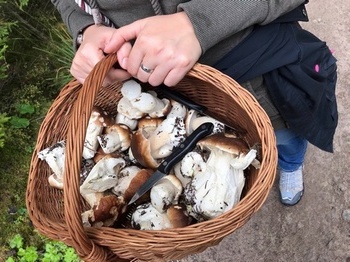 Ich möchte gerne noch ein bisschen weiter ausholen. Seit mein Mann mich letzten Herbst das erste Mal mit zum Pilze sammeln in den Schwarzwald mitgenommen hat und ich gleich bei unserer ersten Tour einen Korb voller erstklassiger Steinpilze mit nach Hause nehmen konnte (Foto rechts), leide ich an »Pilz-Fieber«.