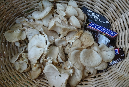 Foto: Snickers statt Steinpilze im Korb - Sven war nicht ganz zufrieden mit seiner Ausbeute in den Wäldern um Bretten. Die Lungenseitlinge scheren sich hingegen um das derzeitige Wetter. Als Holzbewohner sind sie mit hinreichend Feuchtigkeit versorgt. (Foto © Sven)