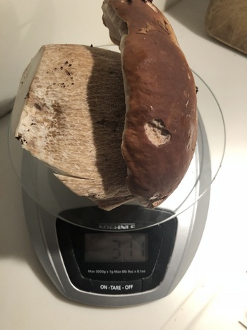 Foto rechts: Welch ein Protz von einem Steinpilz! Obwohl er noch jung und im optimalen Alter ist, bringt er bereits 311 Gramm auf die Waage! Und das, obwohl ihm der Stielansatz schon abgeschnitten wurde.