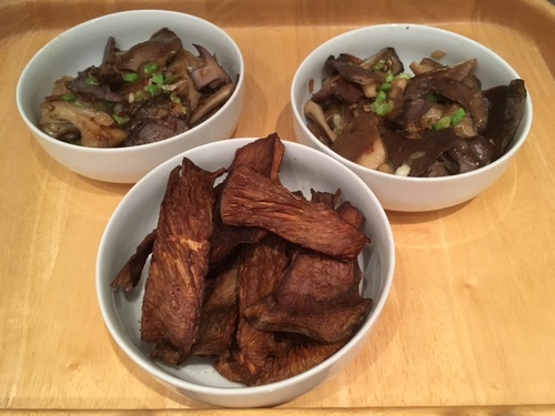 Foto: Austernpilze auf zweierlei Art: Gebraten und in Öl mit Kräutern eingelegt (oben) sowie als geröstete Leckerei aus dem Backofen (unten). (2 Fotos © Ralf)