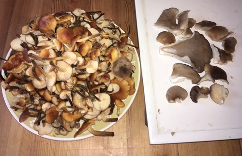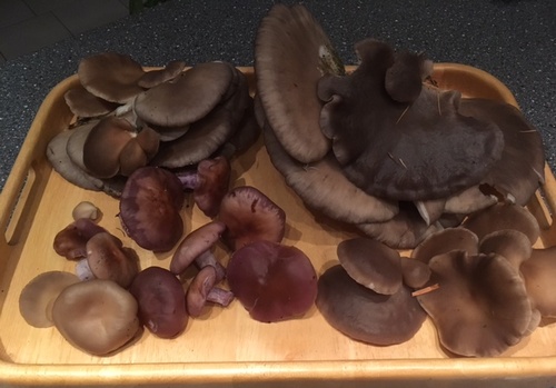 jetzt legen bei uns die Austernseitlinge los. Und als Beifang gab es für mich noch ein paar Violette Rötelritterlinge.