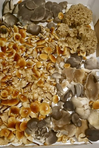 Abgesehen davon gibt es frische Parasole, Tintlinge, Stockschwämmchen und Rauchblättrige Schwefelköpfe. Aber auch Ziegelrote und Grünblättrige mischen sich ein. Zudem gibt es immer noch unzählige Falsche Pfifferlinge. Das Foto rechts zeigt eine meiner bemerkenswerten Dezemberernten.