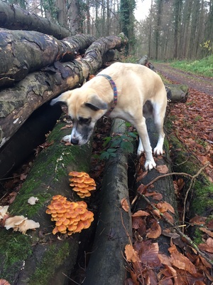 2 Fotos: Da kam doch ganz schön was zusammen. Andreas freute sich über viele Samtfußrüblinge (links), die derzeit entlang des Hüttenpfades im Rittnertwald praktisch an jeder älteren hingestreckten Rotbuche wachsen, sowie Austernseitlinge. Dafür interessierte sich, wie auf dem zweiten Foto zu sehen, auch Supernase Vlore. (3 Fotos © Andreas)