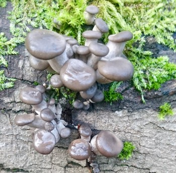 meine Austernseitlinge im Landkreis Calw brauchten gut zwei Wochen bis zur Reife. Heute konnte ich endlich die ausgewachsenen Fruchtkörper (2 Fotos rechts) in aller Frühe von der alten Buche abernten. Knapp drei Kilo dieser Weißfäuleerzeuger landeten in meinem Korb. So macht das Winterpilzesammeln Freude!