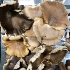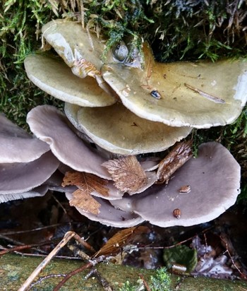 Heute sende ich einige Fotos mit Lungenseitlingen, gut zu erkennen an der in braunen Tönen variierenden Färbung. Sie sind roh etwas wässriger, unterscheiden sich aber nach dem Dünsten oder Braten kaum vom Austerseitling. Beide sind erstklassig im Geschmack.