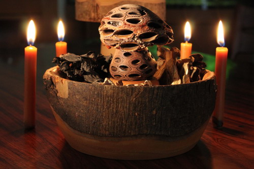 Sie haben mich spontan an meine geliebten Hexenröhrlinge erinnert, so dass ich unbedingt einen mitnehmen mußte. Von vier Kerzen begleitet und einigen Trockenpilzen umgeben, bot er sich dann auch ausgezeichnet für ein schönes Adventsmotiv an.