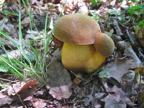 Foto: Dies dürfte ein - ebenfalls seltener - Gelbfüßiger Hexenröhrling sein. Sein Stiel ist durchgehend markant gelb, mit feiner rötlicher Fleckchengebung. Alle weiteren in Frage kommenden Arten hätten deutlich mehr Rotanteile am Stiel. Wie der Flockenstielige Hexenröhrling ist auch der Gelbstielige ein ausgezeichneter Speisepilz.