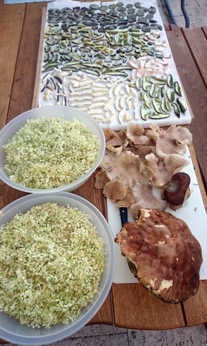 von denen ich einen nachher panieren möchte. Der zweite wird verschenkt, den dritten habe ich mit dem Rest zum Trocknen gelegt, auf dem Foto zu sehen rechts von der unteren Schale mit Holunderblüten.