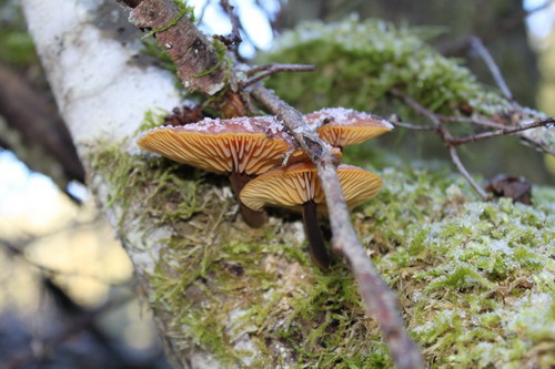 Heute bin ich dann wieder ohne Fotoapparat durch ein Hochmoor spazieren gegangen (es gab keine Sonne und war leicht neblig), als ich an verschiedenen abgestorbenen Birken die zugehörigen Birkenporlinge entdeckte. Ich war bisher der Meinung, dass sie nicht gerade zu den Winterpilzen zählen, da sie ja, wie hier auch zu lesen, im Dezember langsam hinüber sind.