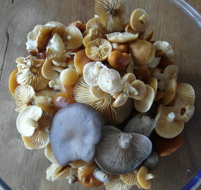Foto links: Ernsts Gesamternte nach einem Gang den Bach entlang. Neben Winterrüblingen wohl einige Austernpilze, die fast so tun, als seien sie Violette Rötelritterlinge. (2 Fotos © Ernst)