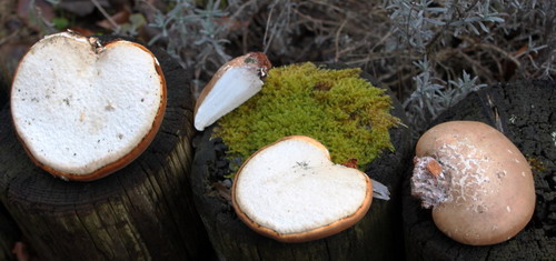 Foto: Frisch geerntete Birkenporlinge. Die fast noch reinweiße Farbe verrät, dass sie beste klimatische Bedingungen hatten. Erst wenn sich an der Unterseite gehäuft grüne Flecken zeigen, soll man die Finger von ihnen lassen.