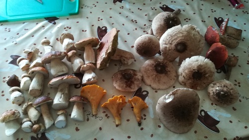 Gefunden habe ich also Sommersteinpilze, einen Fichtensteinpilz, eine Marone, Perlpilze, Laubwaldrotkappen, Flockis, Filzröhrlinge, Rotfüßchen und verschiedene Täublinge (Frauen-, Speise-, Zinnober-, Pfirsich- und Grüngefelderte Täublinge).
