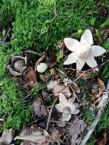In der Früh beim fast täglichen Waldspaziergang mit dem Hund fand ich allerdings am Wegrand eine größere Gruppe von Gewimperten Erdsternen in verschiedenen Entwicklungsstadien. Vereinzelt hatte ich sie schon gesehen. Als Kolonie (Foto rechts) noch nicht. Mich hat der Anblick riesig gefreut.