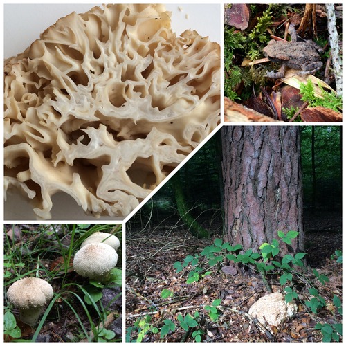 Collage: Die Krause Glucke, gefunden am Stamm einer Kiefer, veredelte ein Pilzrisotto auf köstliche Art. Unten links drei Flaschenstäublinge. Oben rechts eine junge Erdkröte. (Collage/4 Fotos © Monika W.)