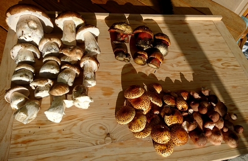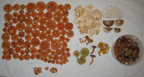 Gefunden haben wir Edel- und Lachsreizker in großer Menge, Steinpilze, Butterpilze, Krause Glucken, Birkenpilze, Pfiffers, Rote und Weiße Semmelstoppelpilze, Birkenporlinge, Goldröhrlinge, Waldchampignons, Kupferrote Gelbfüße und Hallimasch.