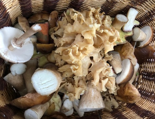 Im Korb landeten viele Maronen und Steinis, Violette Rötelritterlinge, Pfifferlinge, Hallimasche, Flockis, Fichtenreizker, Krause Glucke, Judasohren, Perlpilze, ein Buckeltäubling, eine Handvoll Samtfußrüblinge und ein schöner Riesenchampignon.