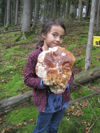 wollte meine Tochter unbedingt einmal mitgehen, was mit dem Fund des wohl größten Steinpilzes meines Lebens endete. Auf dem Foto rechts zeigt die Kleine stolz den riesigen Fund. Zu unserer Freude war der Pilz madenfrei und von bester Qualität. Ins Körbchen wanderten dann noch einige Flockenstielige Hexenröhrlinge.