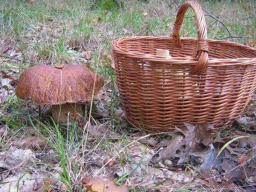 Foto: Hier ein großer Steinpilz mit einem stark zerklüfteten Hut. Und ein zu Dreiviertel gefüllter Korb.