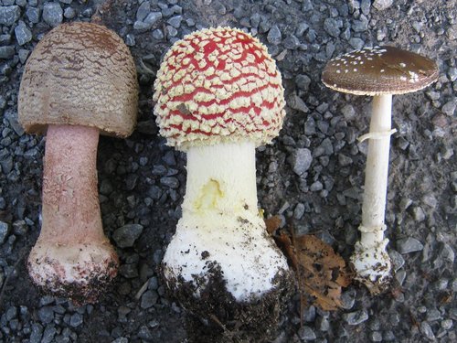 Foto: Drei Wulstlingsarten, zwei davon sind giftig. Wir sehen einen Perlpilz (links), einen jungen Fliegenpilz (Mitte) und rechts einen schon alten Pantherpilz. Man beachte seine Riefung, die allerdings nur die alten Exemplare haben, ferner den »ungeordneten«, hängenden, vergänglichen Ring. Er ist nicht, wie beim Perlpilz und beim Grauen Wulstling, gerieft. Die beim Pantherpilz konzentrisch gleichmäßig angeordneten Schüppchen können bei diesem Exemplar nur bedingt als Merkmal herangezogen werden, weil sie großenteils vom Regen abgespült wurden.