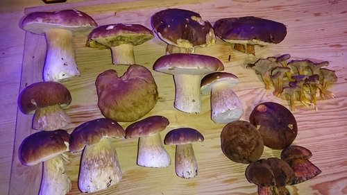Gesammelt haben wir Steinpilze, Flockis, Maronen, Perlpilze, Parasol, eine Krause Glucke vom Abschnitt, Trompetenpfifferlinge, Gemeine Pfiffers, Totentrompeten, Hallimasche, Lila Lacktrichterlinge, Violette Rötelritterlinge, Rote Stoppelpilze, Judasohren, einen Butterpilz und Fichtenreizker.