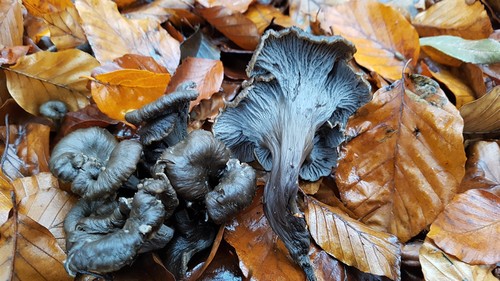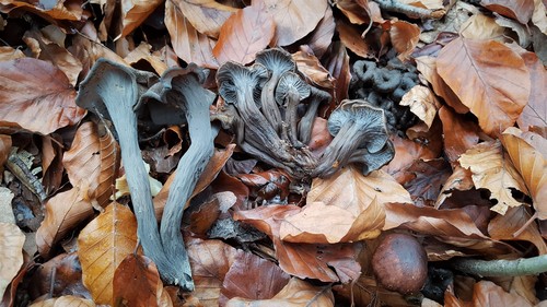 Nun sind sie doch noch da, die lange ersehnten Totentrompeten beziehungsweise Herbsttrompeten. Ich fand sie standesgemäß im Buchenwald in der Nähe von Sulzbach a.d. Murr, dazu auch einige Graue Leistinge sowie Trompetenpfifferlinge.