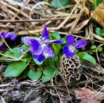 Foto rechts: Eine Speisemorchel neben einem Märzveilchen (Viola odorata). Diese früheste Veilchenart, auch Duftveilchen genannt, wächst in unseren Breiten an Waldrändern oder lichten Waldgestaden auf nährstoffreichem, lehmigem Boden. Womit wir wissen, welche Böden auch Speisemorcheln mögen. In Frankreich werden Märzveilchen engagiert gezüchtet: die Sträußchen sind sehr beliebt, Süßwaren-Hersteller kandieren die Blüten zu einer Köstlichkeit, es gibt teure Parfums, aus den Blättern wird ein edler Veilchenlikör hergestellt. Die Geschichte der Märzveilchen-Kultur ist sehr lesenswert!