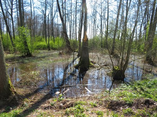 Foto: Land und Pilze unter im Auwald. Ob Michael mit Gummistiefeln unterwegs war, um im Wasser nach Morcheln zu sehen? Auf jeden Fall ist dies zu viel an Naß für die begehrten Frühlingspilze. Für die Region aber dürfte der Regen eine ausgezeichnete Grundlage für die frühen Großpilze wie Hexenröhrlinge, Sommersteinpilze und Pfifferlinge sein.