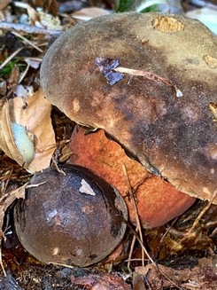 Foto: Renate wollte kaum glauben, dass er schon da war, dieser schöne junge Flockenstielige Hexenröhrling alias Schusterpilz. Sie hatte ihn frühestens in zehn Tagen erwartet. (2 Fotos © Renate)