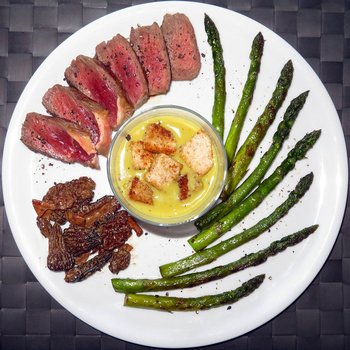 Zur Überbrückung gab es heute ein leckeres Gericht mit getrockneten Morcheln vom Vorjahr für mich und meinen besten Freund. Das Gericht komplett: Rumpsteak zu Crèmesüppchen aus grünem Spargel, Spitzmorcheln in Cognac und gebratener grüner Spargel (Foto rechts).