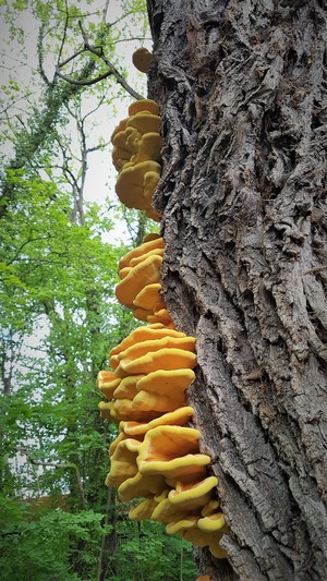 Kurz darauf konnten wir uns an einem Schwefelporling bzw. Eierporling (Laetiporus sulphureus) erfreuen, der eine alte Pappel besiedelte (Foto rechts). Außerdem kamen uns auf der Tour noch ein paar Lungenseitlinge, Rehbraunere Dachpilze und Sklerotienporlinge vor die Linse.