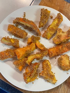 Den Schwefelporling habe ich erstmals probiert, nachdem ich die Stücke in Ei und Semmelbröseln frittiert habe (Fotos unten). Und ich kann sagen, sie schmecken sogar ganz gut!